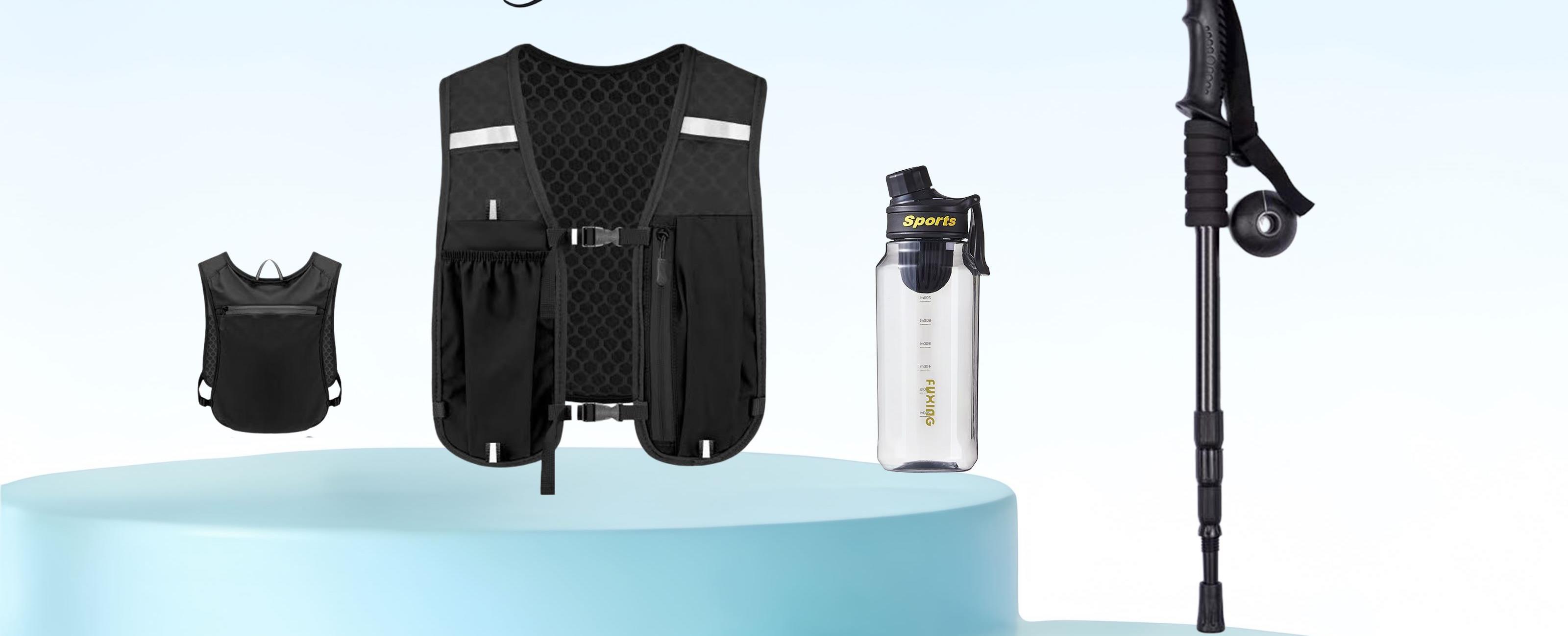 材质:帽子:聚酯纤维 登山杖:铝合金三折叠 马甲包:聚酯纤维 水壶:pvc750ml 规格: 帽子:55-58cm 马甲包:均码 登山杖:65-135cm 组合形式:(防晒帽马甲背包登山杖水杯)