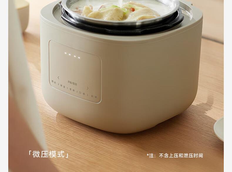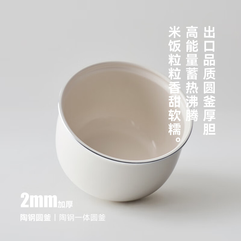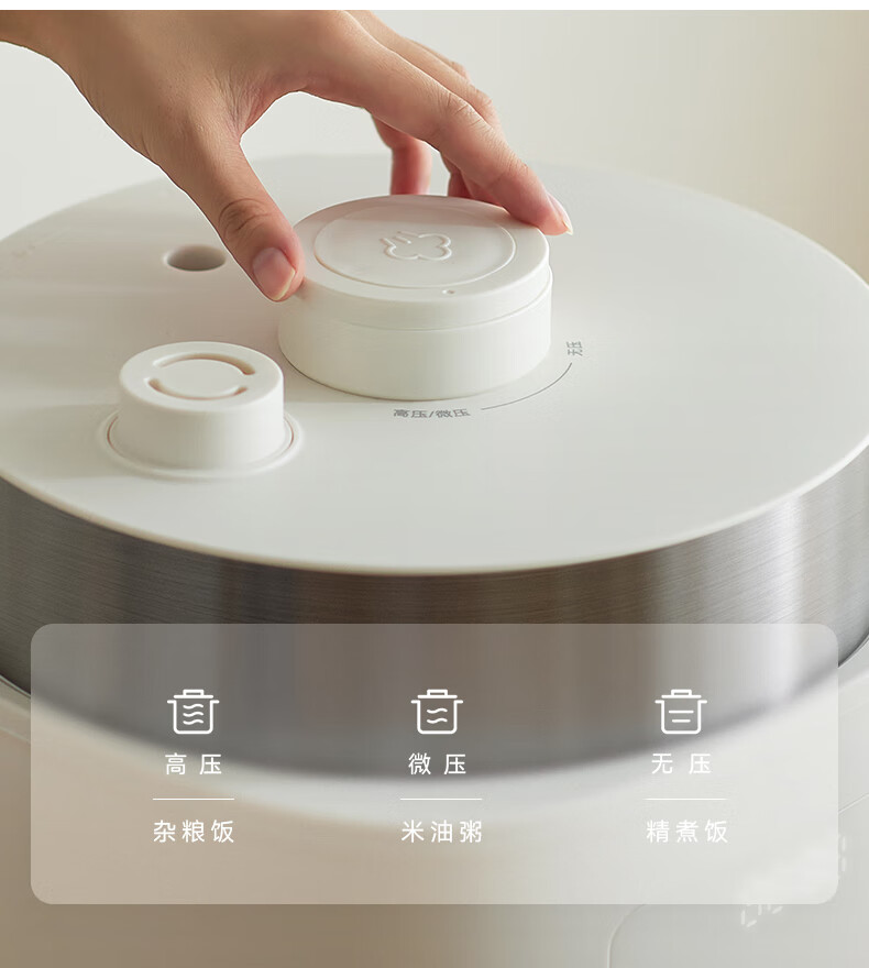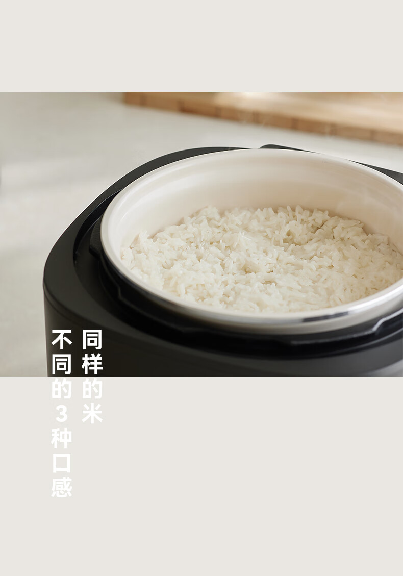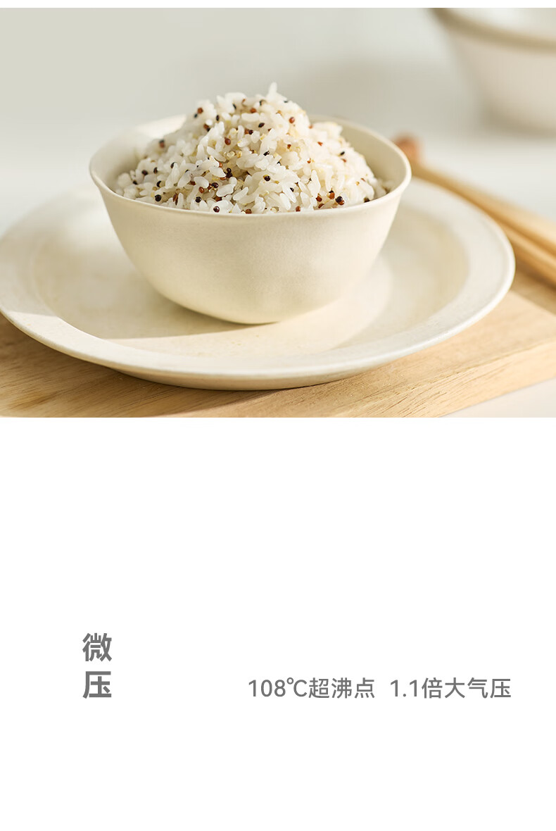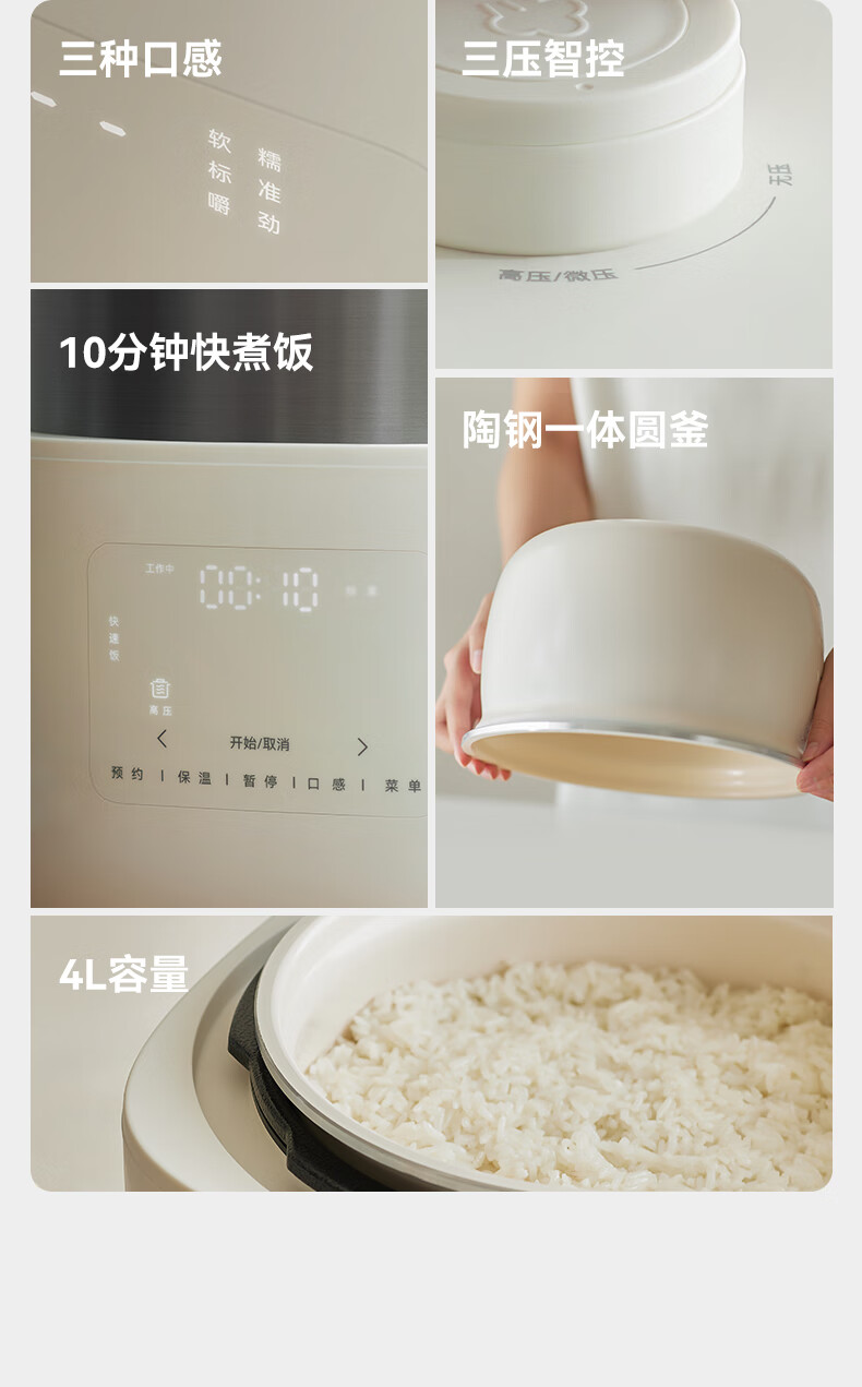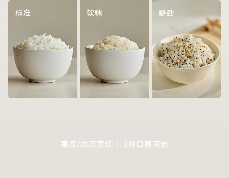 颜色:大地色 容量:4L 重量:6.8KG 内胆:单胆-陶瓷釉 额定功率:1000W 产品尺寸:280*270*285mm 外箱尺寸:360*360*333mm 条码:6977735713038 1. 旋钮调节,高压/微压/无压三种模式 2. 三种口感,多功能适配 3. 碗型发热设计,全锅身受热