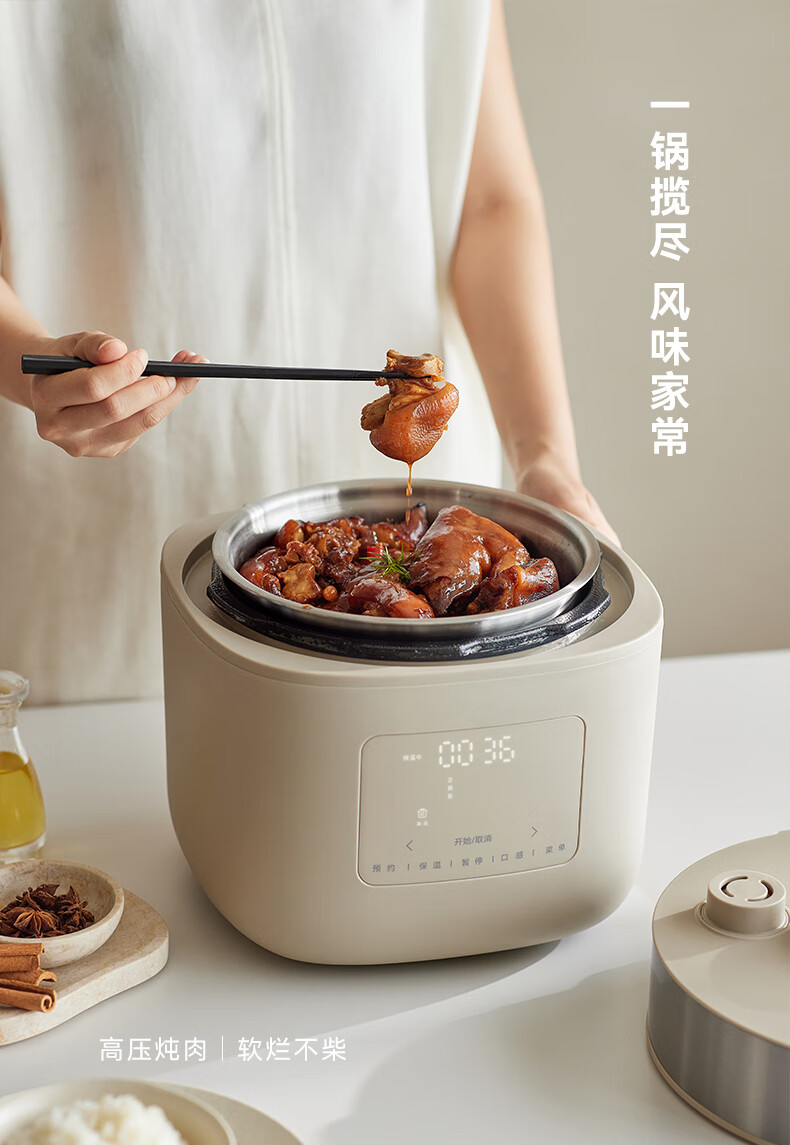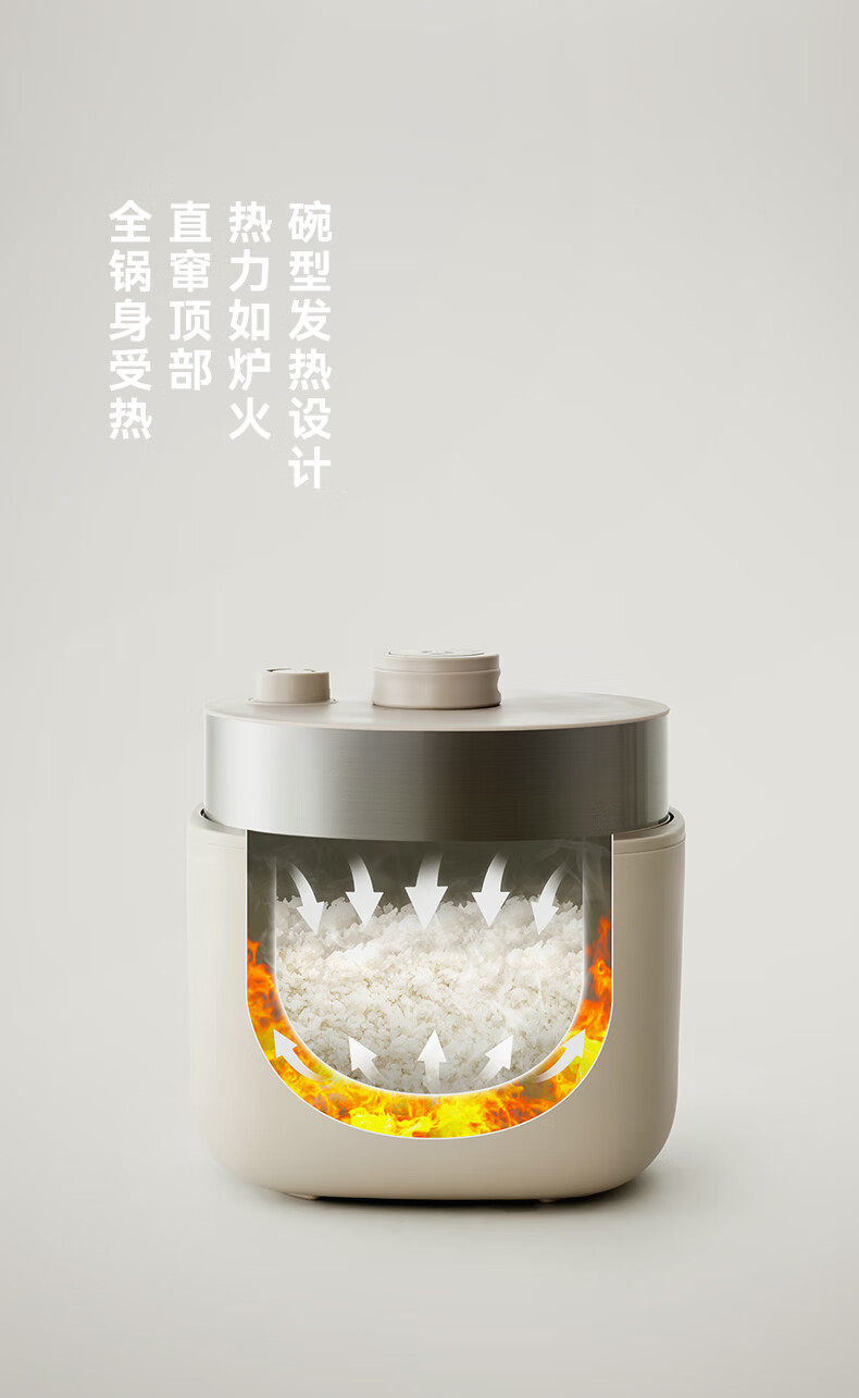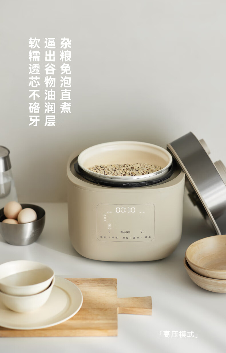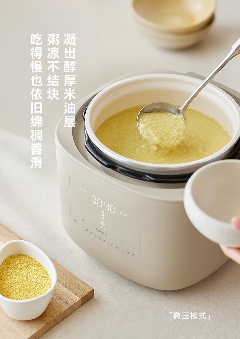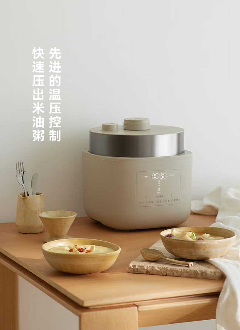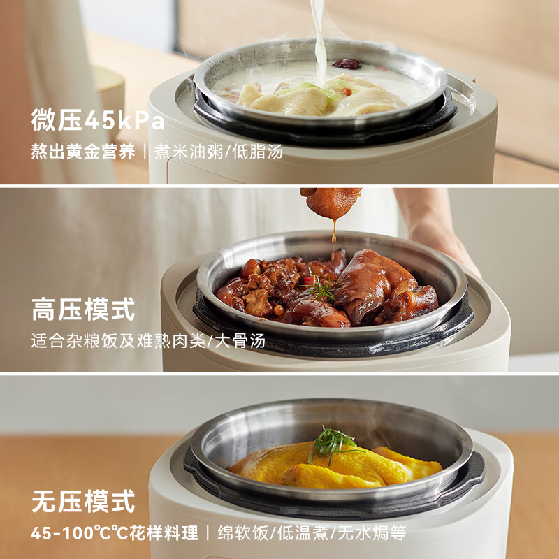 颜色:大地色 容量:4L 重量:6.8KG 内胆:单胆-陶瓷釉 额定功率:1000W 产品尺寸:280*270*285mm 外箱尺寸:360*360*333mm 条码:6977735713038 1. 旋钮调节,高压/微压/无压三种模式 2. 三种口感,多功能适配 3. 碗型发热设计,全锅身受热