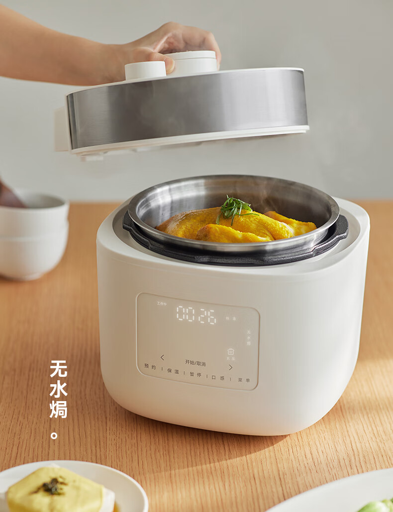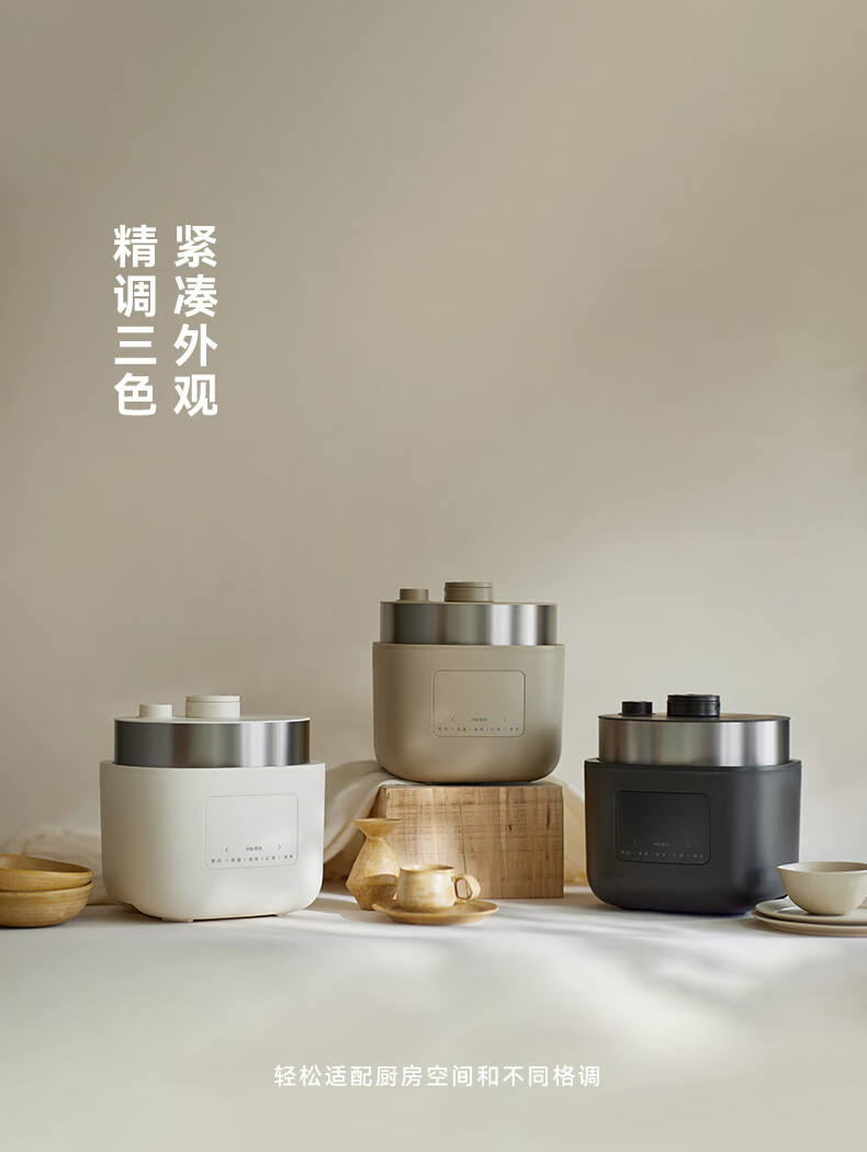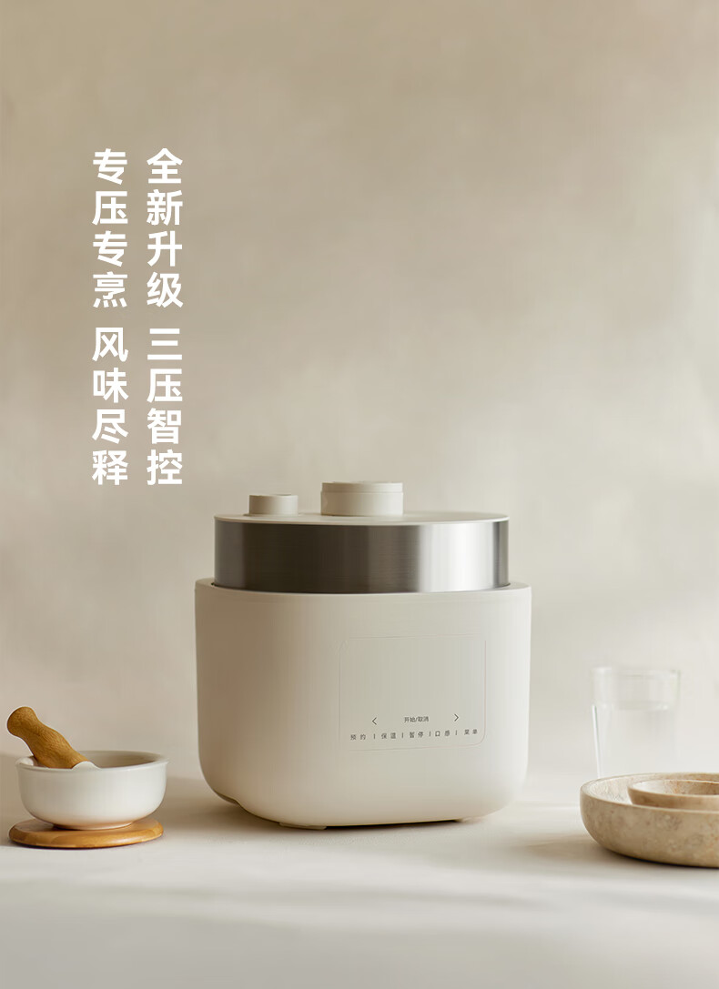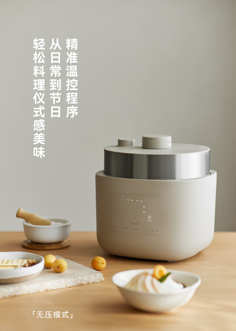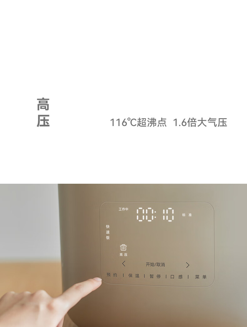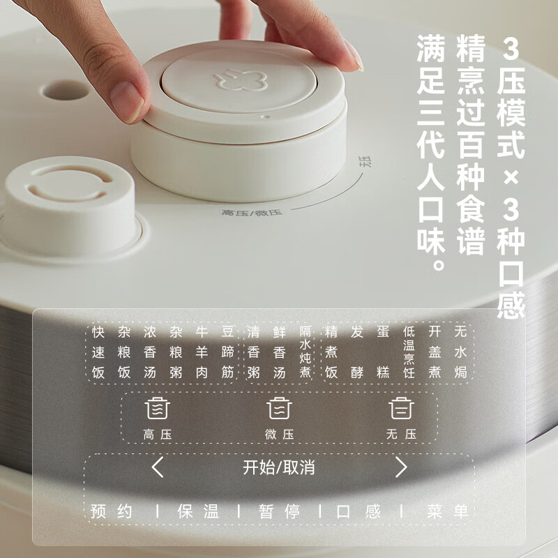 颜色:大地色 容量:4L 重量:6.8KG 内胆:单胆-陶瓷釉 额定功率:1000W 产品尺寸:280*270*285mm 外箱尺寸:360*360*333mm 条码:6977735713038 1. 旋钮调节,高压/微压/无压三种模式 2. 三种口感,多功能适配 3. 碗型发热设计,全锅身受热