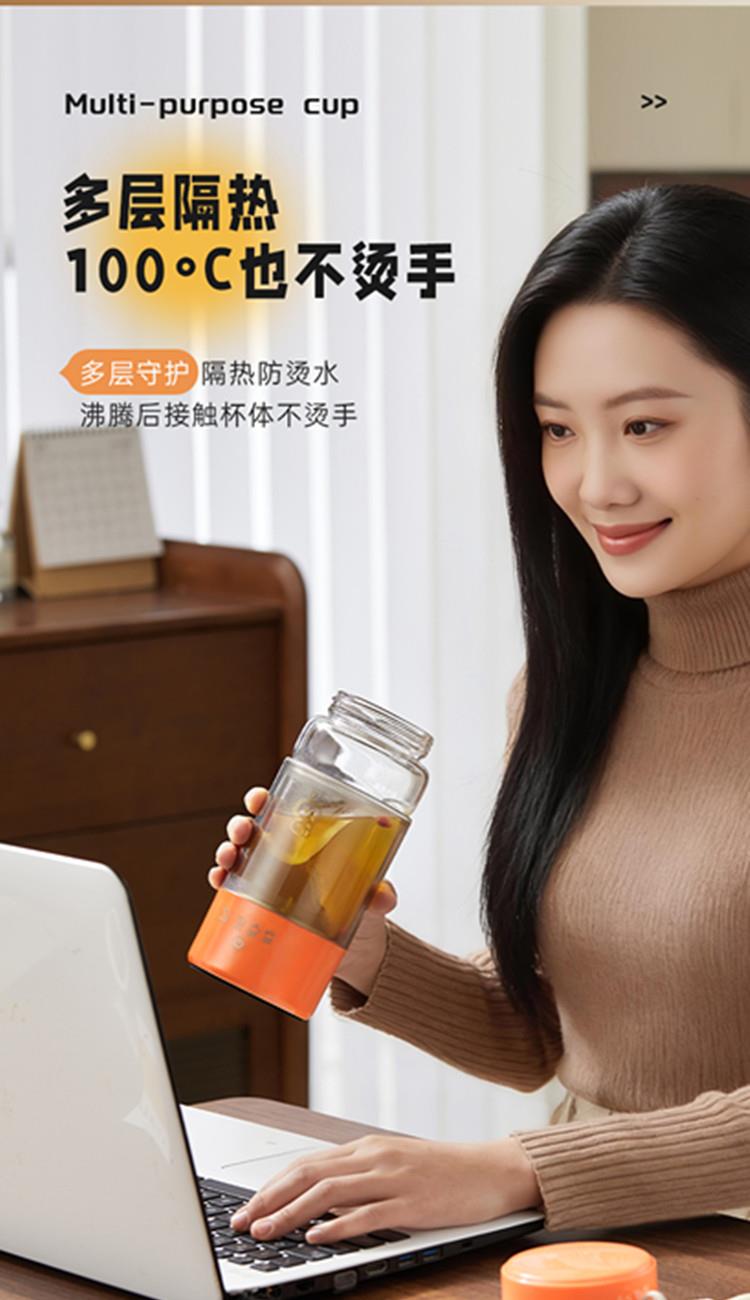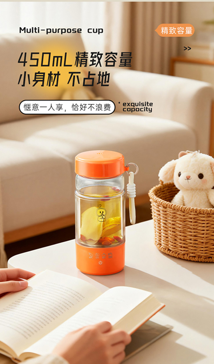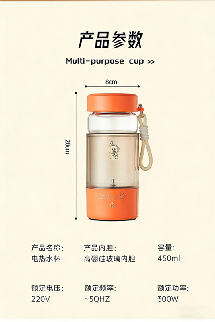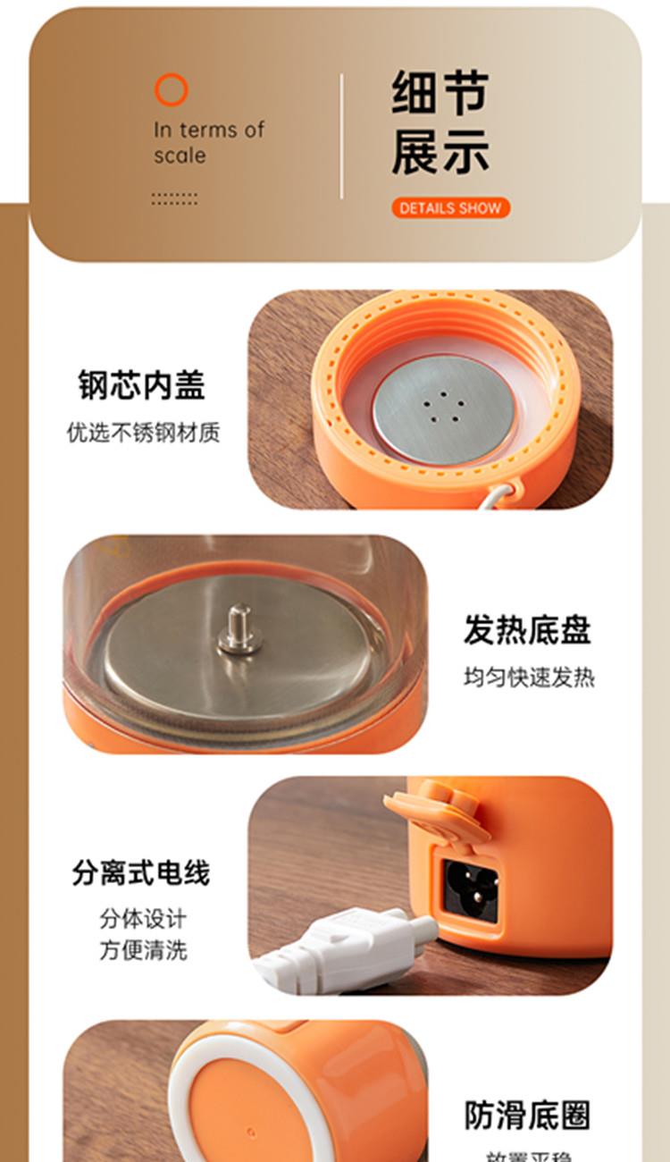 1、450ML大容量,食品级304不锈钢发热盘,整杯0涂层。硅胶防水槽,安全水位标识。
