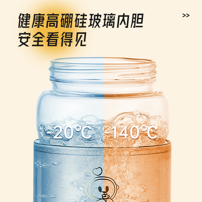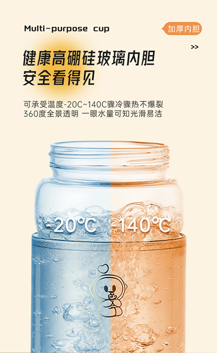 2、双层中空高硼硅玻璃设计,抗酸耐碱,保温/防烫/降噪。