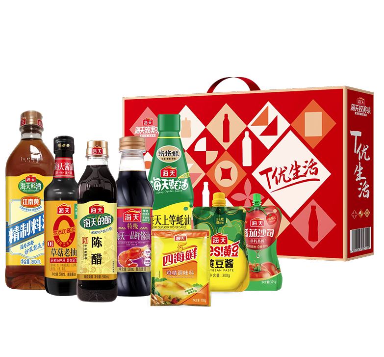 海天上等蚝油700g*(PET瓶) 海天特级一品鲜酱油500mL(PET) 海天0添加草菇老抽500mL(PET瓶) 海天陈醋500mL(PET方瓶) 海天精制料酒800mL(PET瓶) 海天番茄沙司305g 海天黄豆酱300g 海天四海鲜鸡精100g