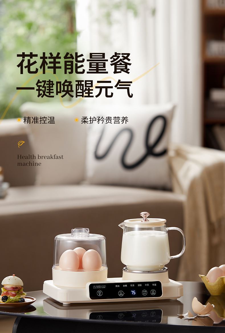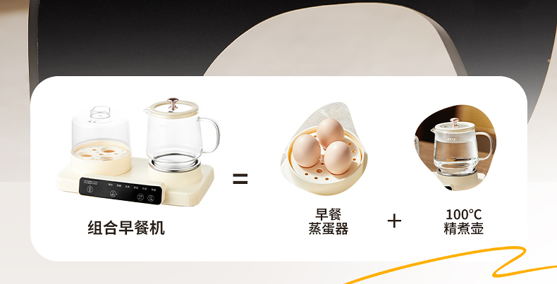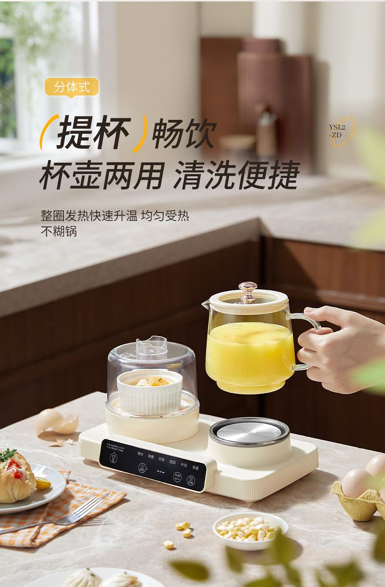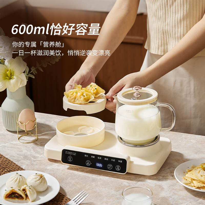 额定功率:470W 颜色:奶油白 主机容量:600ML 规格:二合一养生壶套装 产品款式:微电脑轻触操作 (带数显) 包装清单:蒸蛋架+高硼硅玻璃壶+底座 包装:彩盒包装 特色功能 1、一键蒸煮烹饪,右边炖煮同享; 2、6大预设功能,470W.炖煮更省心; 3、600ML炖煮养生杯恒温杯二合一; 4、分体式养生壶杯壶,清洗方便,提壶即饮; 5、高硼硅玻璃壶轻奢泡茶,高温防干烧自动断电; 6、轻松安装,自动断电,防干烧功能;一机多用,取下直接可用于婴儿暖奶及保温;